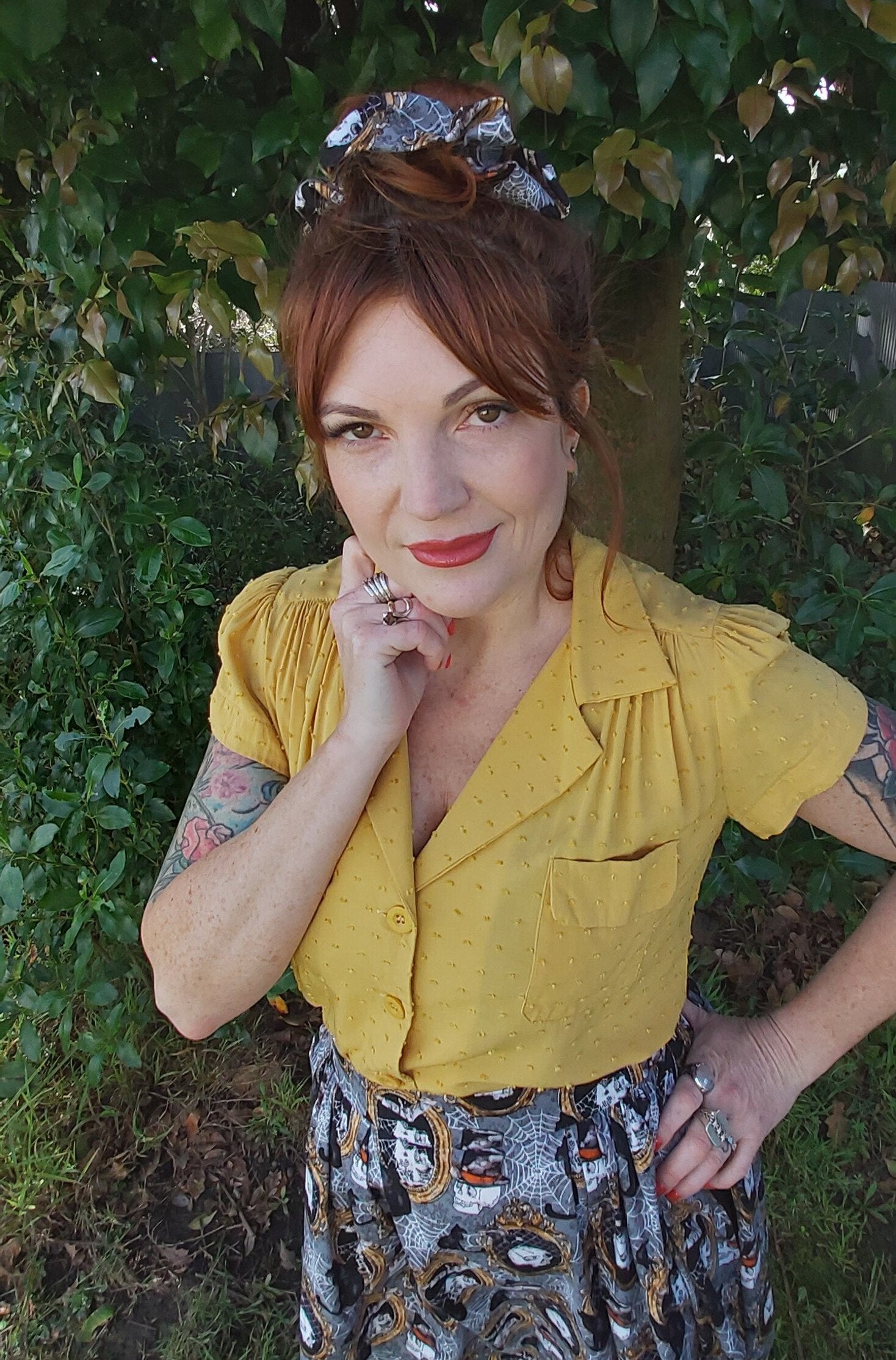 Celebrate spooky season with this playful Halloween print featuring black cats and skulls. The flat front and back with gathered sides create a flattering shape, while deep pockets add everyday practicality.